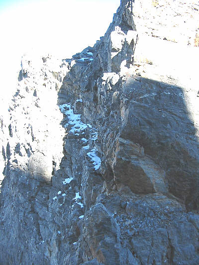 This is looking back (northward) at the second of two pinnacles guarding the connecting ridge between the north and south summits. This pinnacle can be bypassed by traversing the exposed ledge (snowy and in shadow) at bottom left. Click here for a better view of this ledge. |