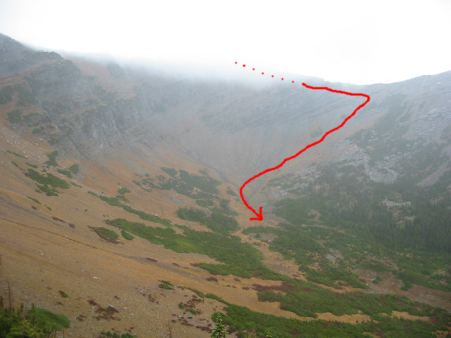This photo, taken from near the top of Buchanan Peak, shows Sonny's route to Mount Alderson. Click here to see Sonny's route down into the basin. |