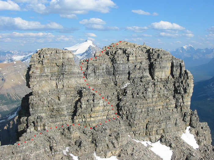 Vern heads toward tower 3. While Vern would traverse below the cliffs and head up the cleft just left of centre, Sonny would prematurely scramble up the rock bands further to the right only to find himself having to backtrack and follow Vern's correct route. |