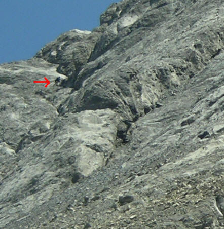 As if nocturnal porcupine attacks weren't exciting enough, Chris and Eddie, while packing up their tent the next morning (24 July 2004), spotted a young adult grizzly bear digging up the turf not far from their campsite.  When I came by their tent to have a look for myself, the bear began wandering in our general direction.  Suddenly, the bear must have caught wind of our presence because it promptly turned around, splashed across Aster Creek, and proceeded to climb up the hill north of the campground.   Once it got sufficiently far enough from us, the bear resumed its diggings on the hill.  Meanwhile, we calmly packed our gear and headed to Aster Lake to ford the outlet stream.  We continued around the north shore of the lake and eventually climbed up the gully north of Warrior Mountain.  Upon reaching the Continental Divide, we met a fellow by the name of Van Belliveau who had just traversed Mount Northover from south to north.  He had arrived at Aster Lake campground late (we weren't even aware he was there) and also had a run-in with some porcupines (there was more than one?) during the night.  Van actually recognized me from my website, so we had quite a long chat about scrambling and other related topics.  He also gave us some useful route information about Northover Ridge before we parted ways.