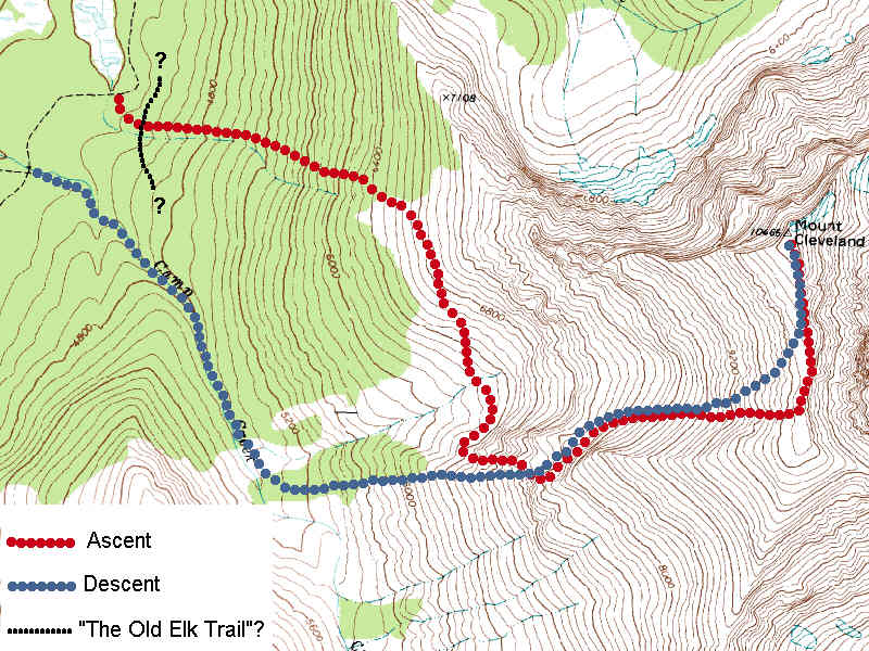 The next day, 4 September 2005, I woke up at about 6:30 AM, and after gulping down an apple Danish and some juice, I was on the trail by 7:09 AM (Kelly would spend a leisurely day in camp mostly by herself).  As per Kane's description, I headed up the left side of the unnamed creek north of Camp Creek.  A short while later, I came across a very faint trail intersecting the beaten path I was following.  The trail looked more overgrown than my beaten path and seemed to lead nowhere, possibly downhill even.  I now suspect that this was "The Old Elk Trail" which Kane used during his ascent, but a lack of expected flagging left me perplexed.  Was this really "The Old Elk Trail", or was there a more well-defined path just further up the creek?  In my scrambling experience, I have always followed an adage of mine:  if in doubt, go up.  In one of those agonizing moments experienced by every off-trail scrambler who has to make a route-finding decision, I elected to continue up alongside the unnamed creek in hopes of coming across a flagged trail.  Boy, did I ever choose incorrectly!