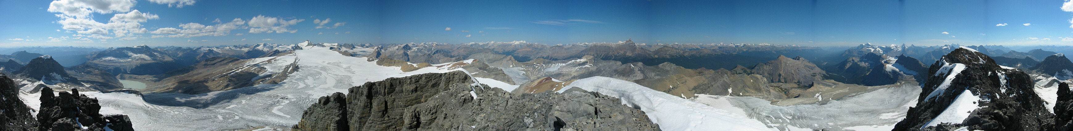 The view southeast includes Bath Glacier and all the big peaks in the Lake Louise area. |