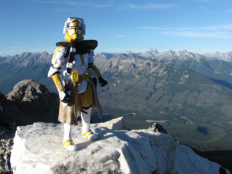Upon clearing the last trees, I was a little shocked to find some seemingly impassable cliff bands guarding the upper ridge. Closer inspection revealed a couple of breaches, and I was soon atop the cliff bands getting my first look at Mount Sinclair’s summit block. My work was not yet done though as I proceeded to scramble over and around several tricky gendarmes (crux) before grinding up an interminable scree slope. My energy flagged considerably on this last slope likely because of a lack of conditioning as well as a lack of sustenance. For some inexplicable reason, I had neglected to bring an energy drink (I had some Tang, but it is a poor substitute for Gatorade), and although I had brought a lunch, the warm weather that day killed all my appetite. Despite developing leg cramps, I persevered and finally dragged myself onto the summit. Following a half-hour stay on top, I began descending but paused shortly after when my cel phone began ringing! With my phone buried in my pack, I was not able to answer the call, but a friend left a voicemail asking if I was interested in golfing the next day. Hoping to avoid expensive roaming charges, I impulsively sent him a text message saying that I would play. Only when I resumed my descent did I begin to wonder if I would even be able to stand up straight the next day let alone play golf.