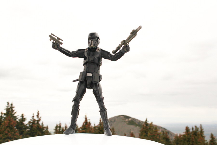 Still trying to figure out which one of these is the biffy! Zosia walks past some more telecommunications buildings as she heads for the east end of the summit.