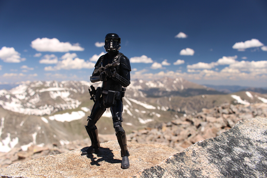 The view to the south includes Kiowa Peak (left), North Arapaho Peak (centre), Navajo Peak (dark and pointy at right) and Apache Peak (biggest on right). Also visible is Mount Evans on the distant horizon at left.