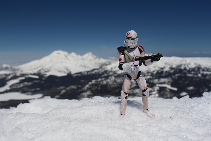 The lodge is a great place for a break on the way up Mount Bachelor. Sonny leaves Pine Marten Lodge behind him as he climbs up the upper slopes of Mount Bachelor.  The Three Sisters and Broken Top (far right) are visible in the distance.