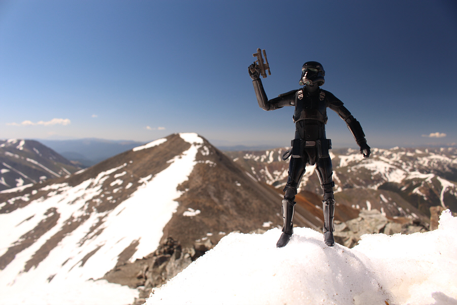 Several named peaks can be readily identified to the southeast including Ruby Mountain (bottom right corner), Decatur Mountain (right) and Square Top Mountain (far left). Barely visible on the left horizon is Pikes Peak. |