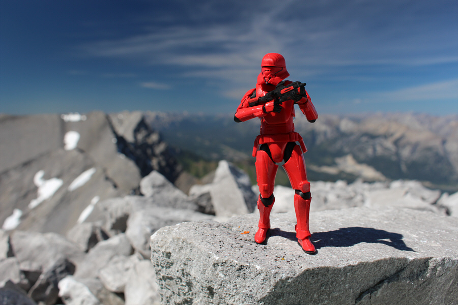 Near the last trees of the open valley, Marta and I got our first good look at Nugara's "direct route", and we were both a little apprehensive about how much snow was still plastered on the south side of the mountain. Fortunately, we were both equipped with ice axes, and Marta had also brought along cleats while I had full crampons. As we progressed up the valley, we made the mistake of trying to gain elevation while side-hill bashing, but the rubble on the valley's sides are very loose and tedious to walk across. It would have been better to stay in the valley bottom longer before climbing directly up to the first big snow patch. Nevertheless, we muddled our way with some difficulty to the bottom of this snow patch and subsequently donned our cleats and crampons. The snow turned out to be ideal for kicking steps, and Marta did a great job of leading us up to the first significant cliff band guarding the upper mountain. We took off our cleats and crampons at the bottom of this cliff band, but unsure if we would need them higher up, we continued to carry them in our packs. The cliff band itself has several weaknesses that can be climbed up (moderate scrambling with mild exposure), and we each took a different route to avoid knocking loose rocks down on each other. Above the cliff band, we were largely able to avoid most subsequent snow patches by veering to climber's right and ascending a mix of scree and slabs. There are many possible route variations here, but the idea is to ultimately gain the crest of the southwest ridge which then leads to a final set of slabs--the crux--about 60 metres below the top. The crux slabs are not too difficult to climb up, but I was thankful that they were dry as there is significant exposure only a short distance to climber's left. The real test would be down-climbing the slabs on the way back. For the moment, I was happy to clear them and grind up the remaining easy rubble to the summit. The views were exceptional on this day due to the amazingly clear skies, and we took an extended break here before commencing our descent.