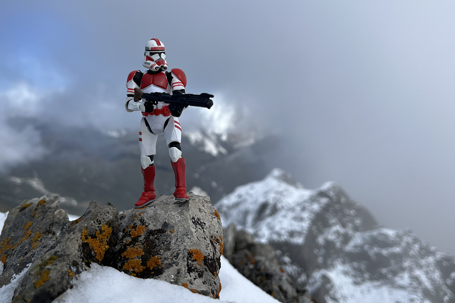 Since the summit is a bit exposed, Asieh, Ali and Zosia retreated down the ridge until they found a safer spot to stop for a break. I stayed behind on the summit hoping for a break in the clouds to snap some photos of distant peaks, but I eventually gave up and descended to join the others. When we resumed our descent, we pretty much retraced our footprints down the ridge and headwall and out the valley. Not surprisingly, the footing was slippery especially on steeper sections such as the headwall, but fortunately, no one went for an involuntary tumble. Upon returning to Smith-Dorrien Creek, we all successfully hopped across without having to don my hip-waders although I think our boots were already wet to varying degrees anyway from hiking in the snow. The subsequent short walk to the highway brought our heroic adventure to an end.